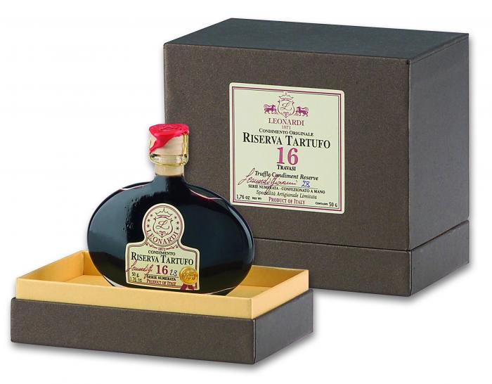 Frutto di un’accurata lavorazione artigianale e di una lunga tradizione di invecchiamento, il Condimento Balsamico Riserva Tartufo – “16 Travasi” è una specialità gastronomica pensata per i palati più esigenti.