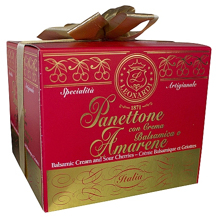 Una variante d’autore della ricetta tradizionale, pensata per stupire con raffinatezza. Il Panettone Amarene e Balsamico Leonardi nasce dalla volontà di dare nuova vita a un grande classico delle feste: al posto della classica uvetta, l’impasto accoglie amarene intere candite, morbide e leggermente acidule, che si armonizzano alla perfezione con l’inconfondibile crema di Aceto Balsamico dolce.