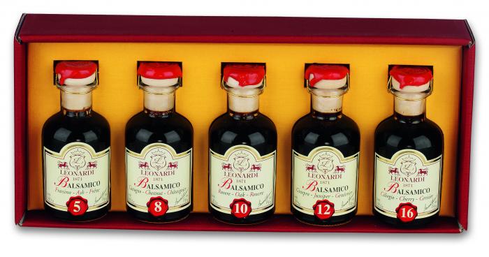 Ogni bottiglietta racchiude un condimento balsamico affinato in botti di un’essenza diversa: frassino, castagno, rovere, ginepro e ciliegio.